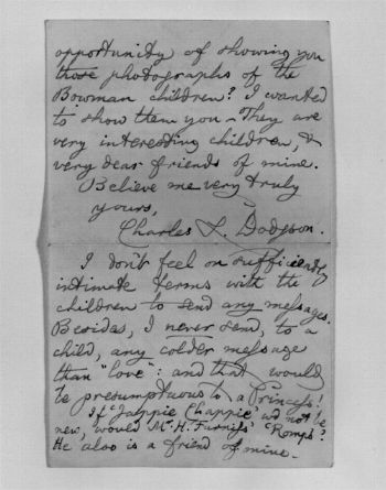 This letter is unpublished; it does not appear in The Letters of Lewis Carroll, edited by M.N. Cohen, which includes only one other letter by Dodgson to Princess Alice, in which he tells her about 'Children's Tins' ('...Whenever Charlie is very naughty, you can just pop him in, and shut the lid! Then he'll soon be good...'). He continued to write occasionally to the two children until the early 1890s, and to send them books ('...you'll say to yourself "Oh dear, oh dear!...Here's another horrid book: and oh what a lot of reading! Why didn't he send me a Kitten?...').