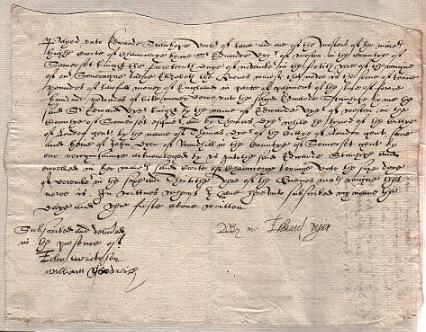 DYER (Sir EDWARD, 1543-1607, poet and courtier) ATTRACTIVE DOCUMENT SIGNED ('By me Edward Dyer'), an indenture and acquittance by 'S[i]r Edwarde Dyer of Weston in the Countye of Somerset knight' for £10 paid to Edward Stanhope, Doctor of Law and Master of the Queen's High Court, in part payment of £400 due to Stanhope by Dyer and by Thomas Dyer, 'while he lyved of the Cittye of London', son and heir of John Dyer of Roundhill, Somerset, by their recognizance of 6 December 36 Elizabeth, written on paper, 1 page, oblong large octavo, indented at head, signatures of two witnesses, Stanhope's autograph docket on verso, 14 November 1598