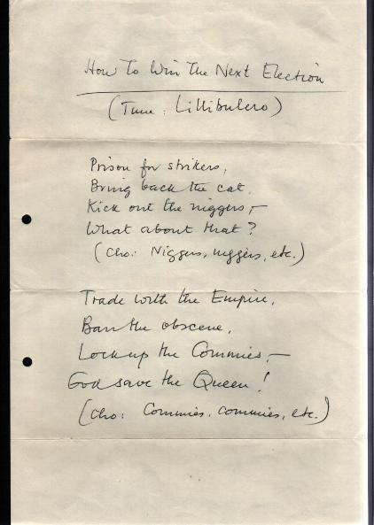 LARKIN (PHILIP, 1922-1985, poet and librarian) AUTOGRAPH MANUSCRIPT OF HIS POEM 'HOW TO WIN THE NEXT ELECTION (TUNE: LILLIBULERO'), comprising ten lines including choruses, and beginning: "Prison for strikers,/ Bring back the cat..." and ending "...Lock up the Commies, -- / God save the Queen!/ (Cho[rus]: Commies, commies, etc.)", 1 page, folio, filing holes [1970]