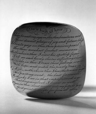 POETRY. EARLY NINETEENTH-CENTURY SONNET FINELY ENGRAVED ON A SILVER MEMORIAL PLAQUE, THE REVERSE CONTAINING A LOCK OF HAIR AND PEARL, THE SUBJECTS OF THE POEM, the hair arranged under glass like two waves with a central floral motif on a beige background with sprays of gold thread and one pearl, the poem engraved in a cursive Italic script with the title 'On a lock of hair' in a calligraphic cartouche, the silver octagonal convex plaque with rounded corners, c. 3¼ x 2¾ inches [undated or hallmarked, but early nineteenth-century] The sonnet is a lament by a woman for her lost love, comforted by the hair and pearl: