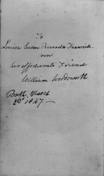 Louisa was joint-hostess with her aunt (then 'poorly - not absolutely ill, but old and feeble') when the Wordsworths stayed between 3 March and 18 April 1847 at the house Isabella had taken in Bath, 8 Queen Square. There was a programme of entertainment, and the visitors included Professor Adam Sedgwick and Sara Coleridge, the poet's daughter and her daughter Edith. Crabb Robinson was also staying at the house and records in his diary that they spent their time playing whist and in 'grave talk'. Otherwise Wordsworth and Crabb Robinson rather tired themselves walking over the heights to Witcombe. It was while he was at Bath that Wordsworth received a request for an 'Ode on the Installation of his Royal Highness Prince Albert as Chancellor of the University of Cambridge' and discussed it with Isabella Fenwick.